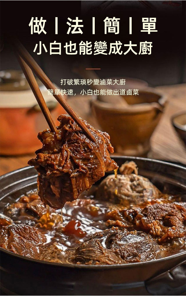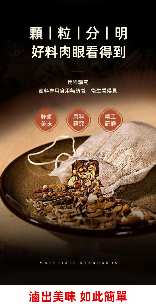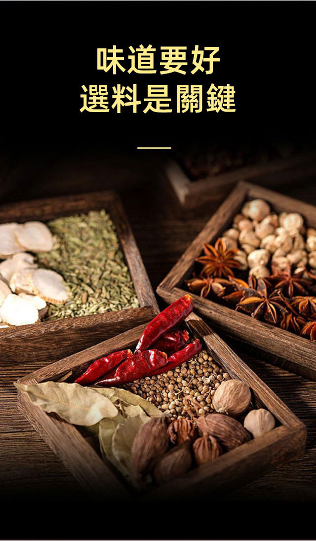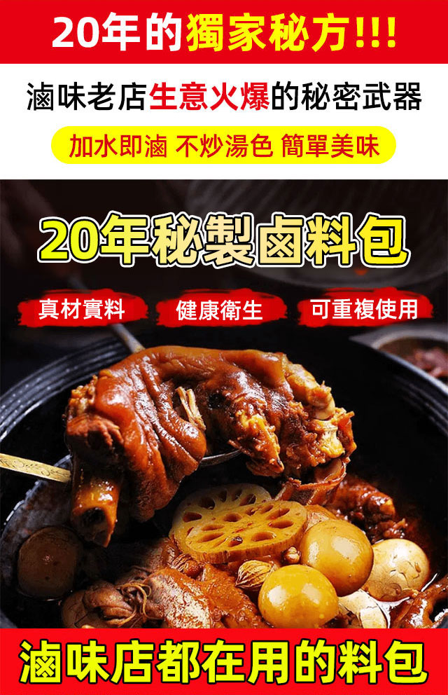 20年獨家秘方就是不一樣!一包搞定台灣經典味! 30分鐘鹵出餐廳級美味!連美食評論家都說:最驚豔的是層次感!前調是八角清香,中段是肉桂甘甜,後韻帶著丁香回甘,完全不像現成鹵包!